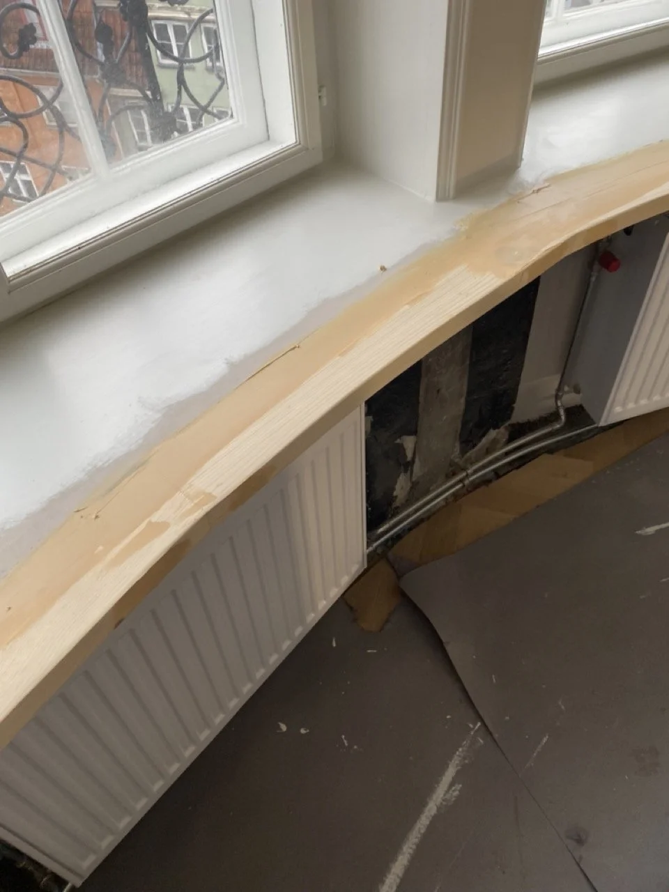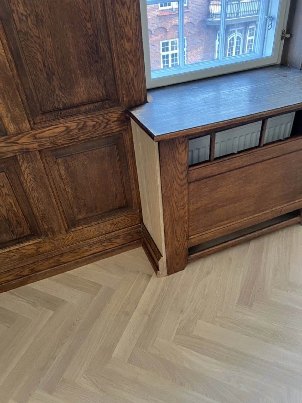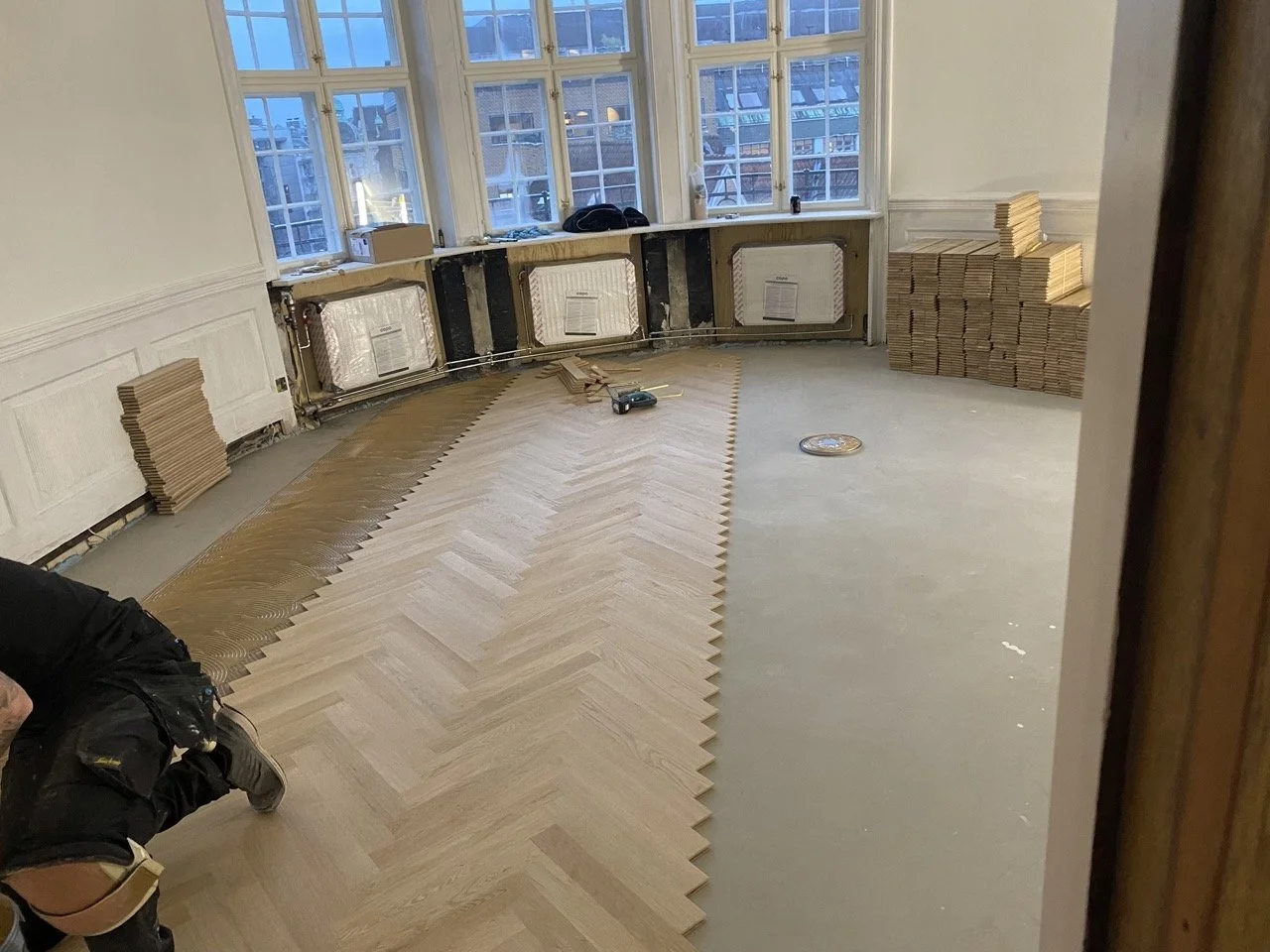 Udlægning af nyt egetræs sildebensgulv i hele lejemålet